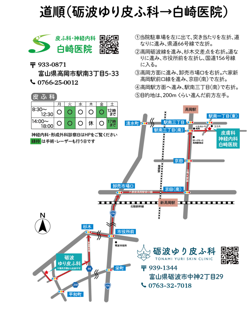 お薬のこと砺波ゆり皮ふ科の患者様へ 2026.04.07白崎医院の診察時間と砺波から白崎医院までの経路です。気をつけてご来院下さい。20260224_A5医師の出番表配布用ダウンロード アイラインのアートメイク、モニター募集のお知らせ前の記事